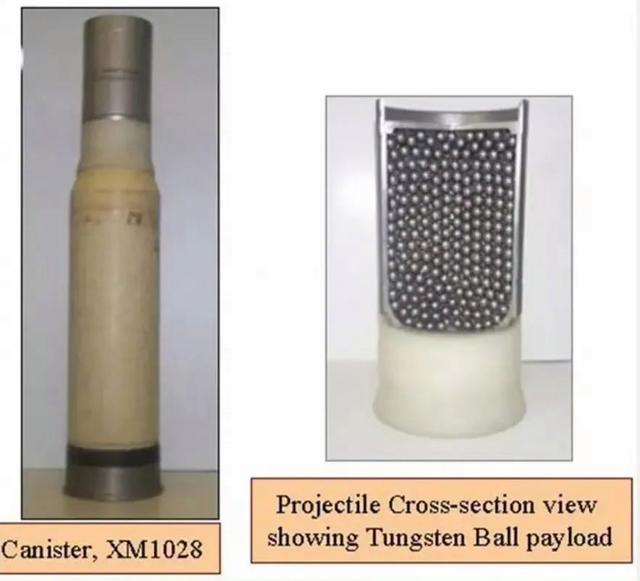 M1028炮射霰弹的炮弹内装有1100颗钨合金弹丸,每颗弹丸的重量为9.3克,速度可以达到1400米/秒,喷射出去的效果堪比一把巨型“霰弹枪”。M1028霰弹可以打击暴露步兵,也可以攻击汽车等目标,甚至能轰击薄装甲目标或混凝土工事。